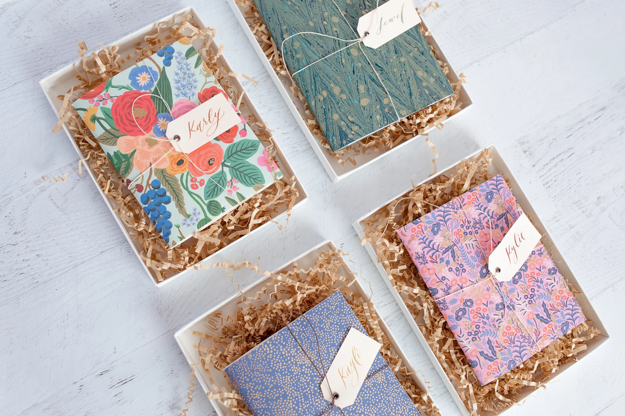 Thankfully, I found a few by Rifle Paper Co. at Paper Source. Their Tapestry Pocket Journals came in a set of 2 and each notebook, measuring 4.25”x5.5”, fit perfectly in Paper Source’s white box mailers.