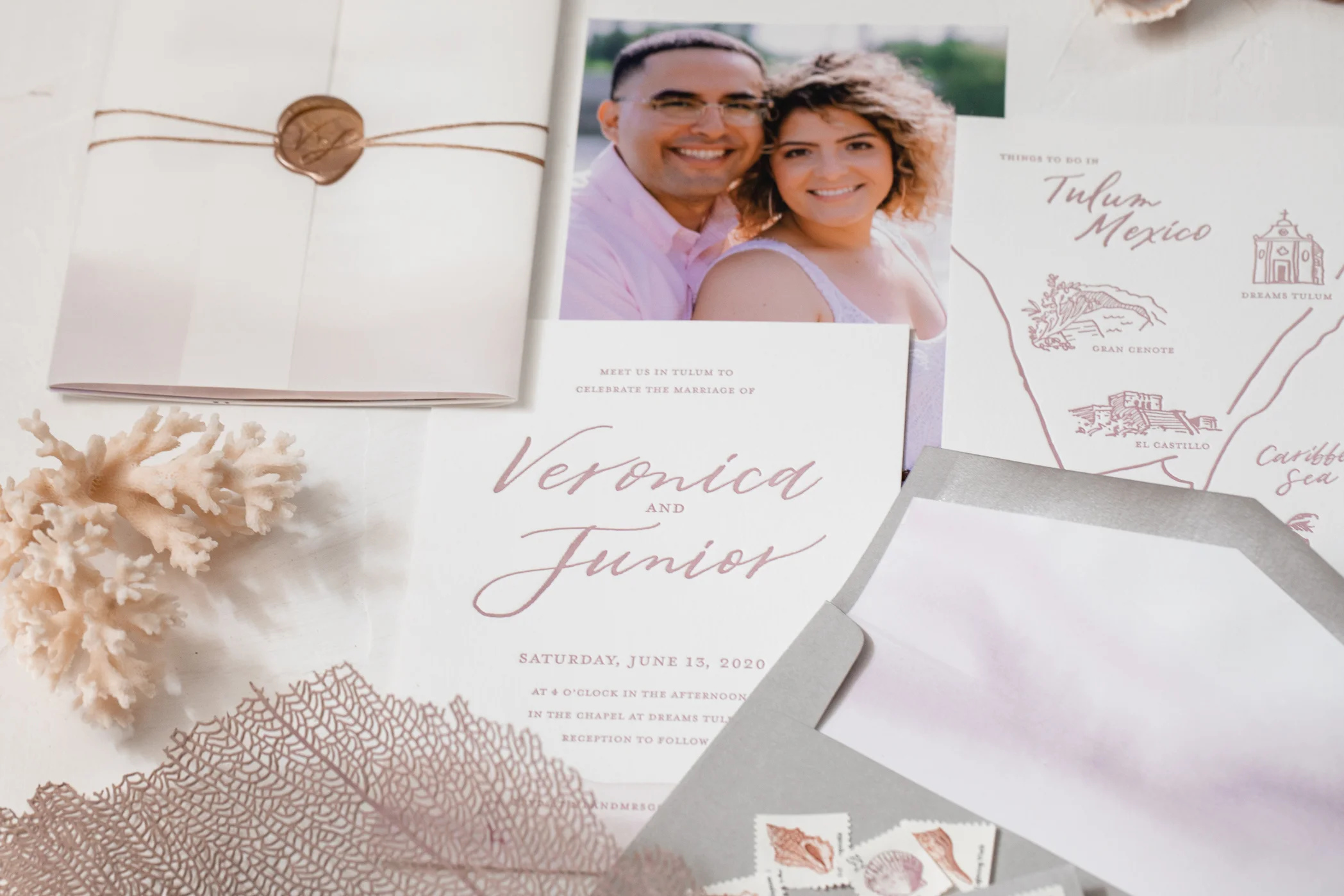 The components of the suite would be simple but elevated with fine papers and exquisite details. The suite would include an invite directing guests to RSVP online, a map of things to do in Tulum and photo keepsake of the couple. As many elements as possible would be customized and created by hand for a premium look and feel.