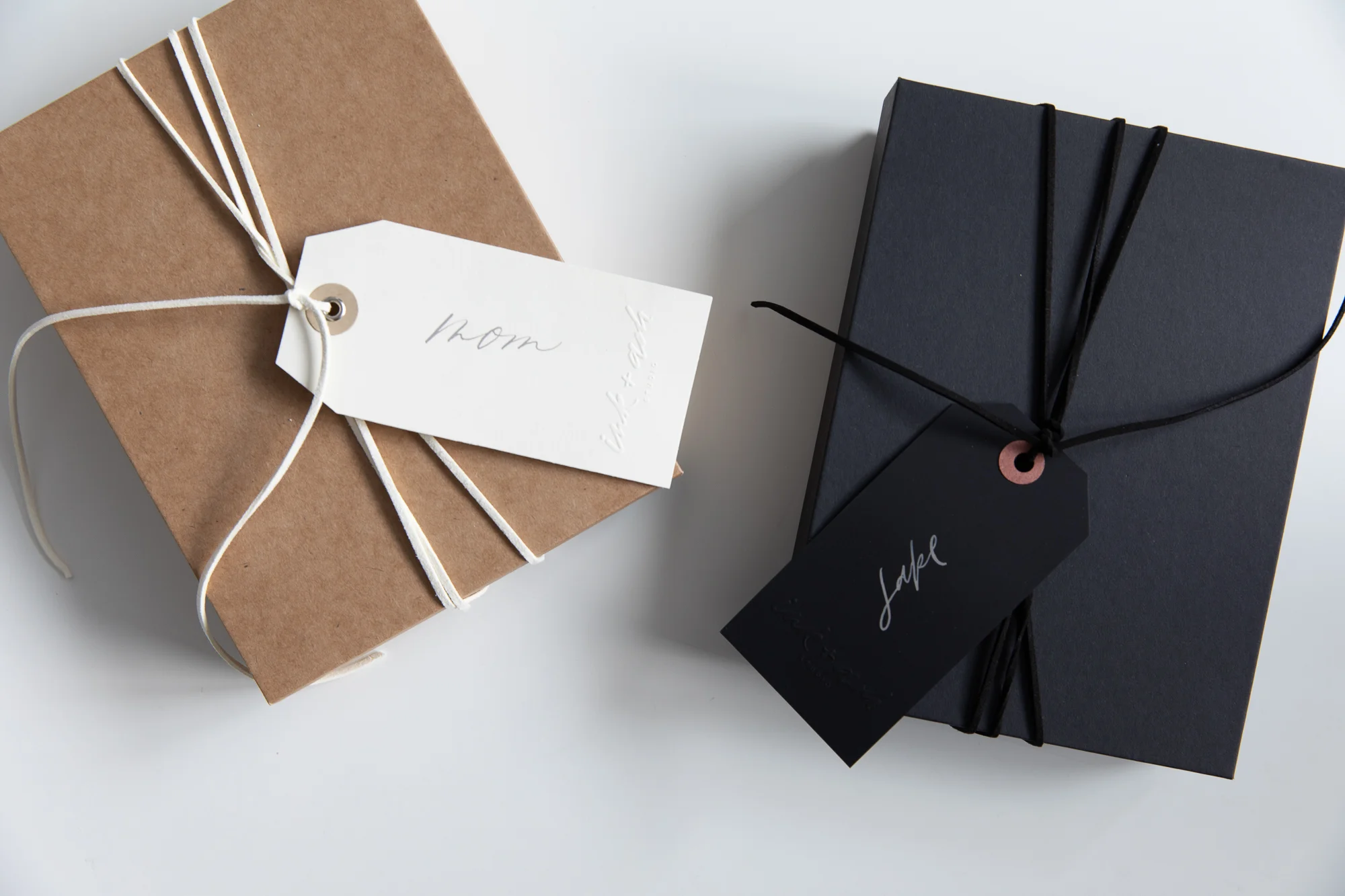 I prefer to have my order shipped to me. Then I can personalize it even further with the wrapping and note. For these, i wanted something very minimal. I found perfectly sized boxes in kraft and black at Michaels and rested the unwrapped calendars on a bed of high-quality crinkle paper. I nested in a note on blank matching stationery from Paper Source’s Paper Bar and added some ink+ash branding with my wax seal or embosser.